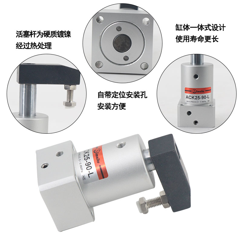 斯麥特生產(chǎn)的ACK系列轉(zhuǎn)角旋轉(zhuǎn)氣缸密封件材質(zhì)保證了氣缸在各種條件下使用的可靠性能;三導向槽結(jié)構(gòu),導向精度高;工作方式有單邊與雙邊(90°);旋轉(zhuǎn)方式有左旋和右旋;90°和180°;活塞桿材質(zhì)鍍鎳,經(jīng)熱處理后,能保證使用壽命。