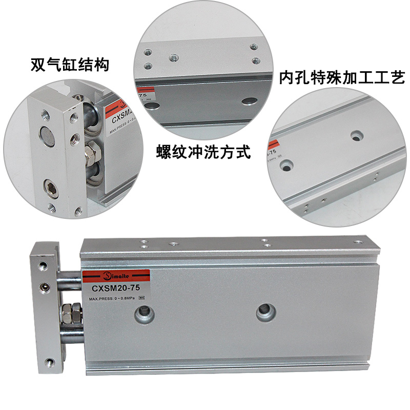 2、CXSM雙軸氣缸螺紋采用沖洗方式,平整順滑,內(nèi)孔采用特殊加工工藝,摩擦阻力小,