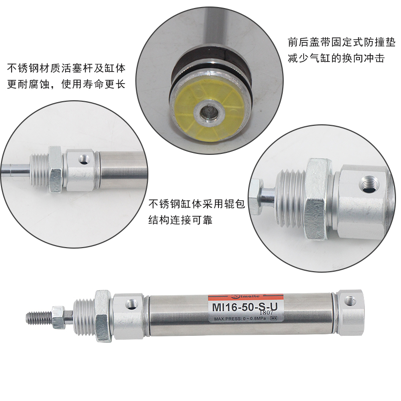 4、不銹鋼材質(zhì)活塞桿與缸體,使迷你氣缸能適應一般腐蝕性工作環(huán)境;